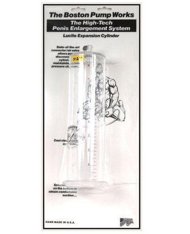 The use of a penis pump creates a level of vacuum that will stretch and enlarge tissues. This high-expansion cylinder is cast of clear Lucite. It is flared outward at the bottom and has a slight inward roll at the opening, which acts as a built-in cockring and a comfortable seal without messy gaskets. This 9.5in long cylinder also features a state-of-the-art connector/air valve that allows the pump to be disconnected from the expansion cylinder while maintaining the exact pressure you choose. It also features a growth indicator to measure your progress. This 2.5 inch Boston Pump Works Lucite Cylinder fits basic Boston Pump Works Pump. Come grow with the Cadillac of pumps and pump accessories!