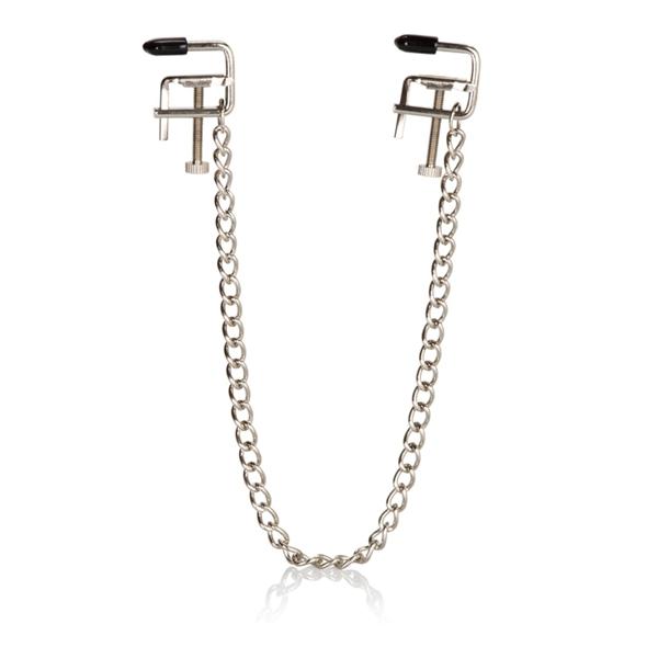 Nipple Play Padded Vises. Includes 2 fully adjustable multi-use clamps. Unique vise design. Soft, comfortable pads. Sturdy high quality dual chain for added sensuality. Non-tarnishing, nickel free. Safe and pure for body and pleasure made using phthalate free materials. Nickel free Iron chains, clamps, PVC pads. 1 inch by 1.25 inches each nipple clamp. 14.75 inches overall length. Bulk weight 2 ounces.