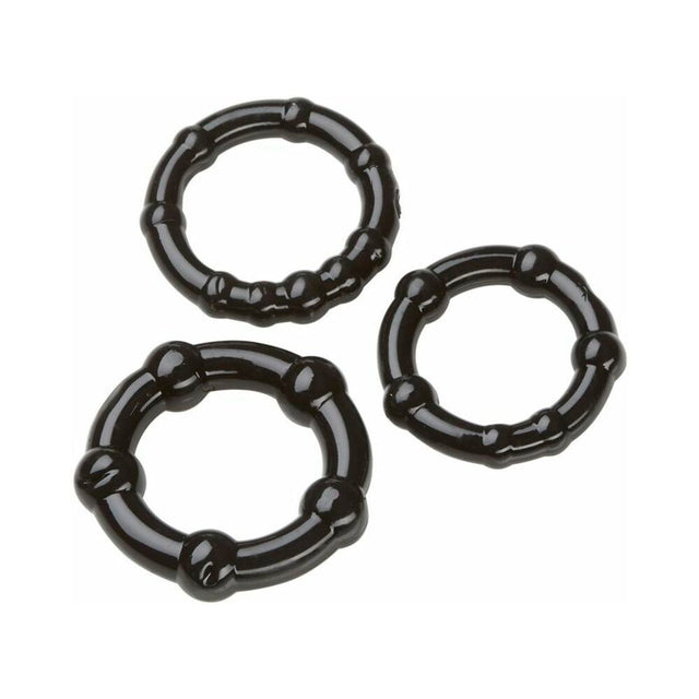 Cloud 9 Novelties Super Stretch Donut Stay Hard Ring Combo Pack includes a trio of super soft skin safe rings. These ring can help you stay harder longer and prolong ejaculation. Cloud 9 cock rings are made of phthalate free, non-toxic thermoplastic rubber (TPR). The rings are comfortable and made specifically for your safety and hygiene during your intimate play. Cloud 9 cock rings can be used individually or together. Cock rings give you a longer lasting erection by trapping the blood supply in the penis and intensifying your orgasm! Cock rings are ideal for men suffering from erectile dysfunction and premature ejaculation. Always use a water based personal lubricant with this product for maximum pleasure. Do not wear a cock ring for more than 30 minutes at a time. Cock ring specifactions: all rings: .75 inch diameter, total packaged weight .05 pound. Rings are blue, black and clear. Phthalate free, Body Safe, TPR. Manufactured for Cloud 9 Novelties. Made in China.