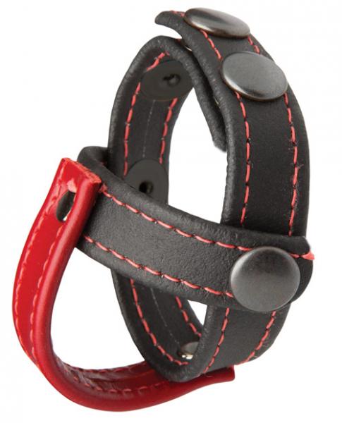 Kink Cock and Ball Sub Presenter. Push up effect and tight fit accentuate wearer's penis. Genuine soft red and black leather. Ball splitter enhances hardness and sensitivity. Black metal hardwear. Inner diameter 2.1 inches. Depth .6 inch. From Doc Johnson Kink line.