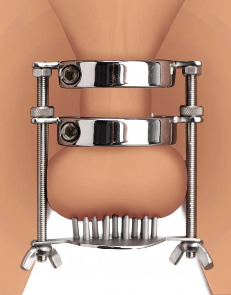 This CBT tool will make you wonder what the heck you were thinking! The weight alone will test your endurance, pulling down on your scrotum with over a pound of metal. Experience the painful pleasure on your own or with a partner, using the allen wrench to open and close the rings. Customize the experience by adjusting the nuts and fasteners to control the positioning of the rings on the shanks. Finally, this wicked device introduces another element of agony: wing nuts control a plate of sharp nails that can be raised to prick at those desperate balls! Each of the 19 points will deliver delicious agony while the stretcher and gravity do their work!