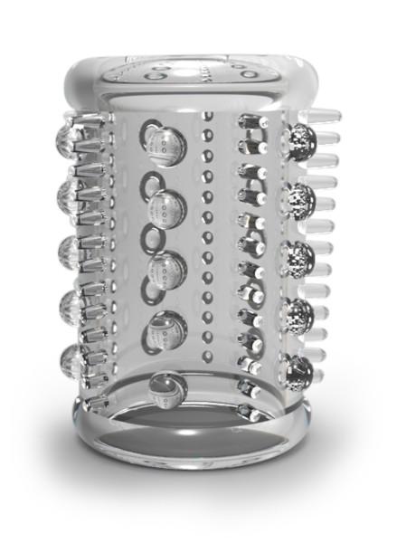 Stay Hard Cock Sleeve 03 Clear. This stretchy enhancement sleeve is a simple way to add a new level of pleasure and sensation to your rod or favorite dildo. Just slide the sleeve over your shaft. Easy to use, and stays in place! Specifications: strong and stretchy. Textured for intense stimulation. One size fits most. 6 shapes and textures to try! Phthalate and latex free. TPE material. Length 2.04 inches. Diameter 1.57 inches. Circumference 4.92. Product weight without package .4 ounce.