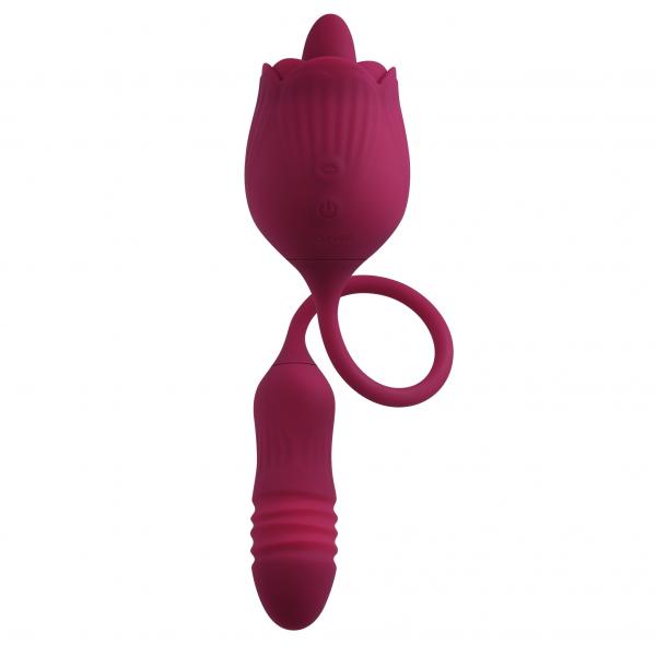 Evolved Wild Rose Red Vibrator has two unique sensations connect with a flexible cord in this extraordinary adult toy that delivers delicious pleasure in two exquisite ways! A textured, vibrating, thrusting bullet on one end ramps up to 10 speeds for a surprising spontaneous feel, while the velvet smooth rose at the other end surrounds a 10 speed vibrating, flicking tongue that targets with intensity. Experience one feature at a time or both simultaneously with independently controlled motors. Water submersible, easy to clean, USB magnetic rechargeable. Features: thrusting bullet vibrator with tongue flicking rose. Powerful 10 speed vibrating, thrusting bullet. 10 speed vibrating, flicking tongue inside rose. Connected by flexible Silicone cord. 2 motors controlled separately. Rose and bullet vibrator textured for stimulation. Easy to use 2 button control panel. Light Emitting Diode LED lights illuminate buttons when in use. Made from creamy smooth Silicone. Size height 13.61 inches, depth 2.19 inches, width 2.19 inches. Insertable bullet vibrator length 3.75 inches, insertable diameter 1.15 inches. .25 inch thrusting distance. Bulk weight under half a pound, .5 lb. Phthalate free and latex free. Waterproof vibrations and submersible in water for an out of the bedroom use. Magnetic rechargeable, USB cable included. 5 years warranty. Categories: Clitoral Stimulator, Rechargeable Vibrators, Tongue Vibrators, Sex Toys for Women. 2022.