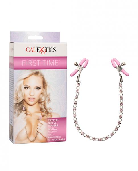 Push sensation to the next level and enjoy teasing nipple play with the First Time® Crystal Nipple Teasers. Explore elevated sensation with the 2 fully adjustable nipple clamps, teasing chain and sparkling crystals. Reach new levels of playful pleasure with the adjustable clamps. Clamp the naughty clasps to your body and enjoy every rush of pain and pleasure. The teasing clamp has adjustable tension to stimulate anywhere on your body for playful teasing. As the tension tightens, the tingles intensify with every turn of the dial for the ultimate in nipple stimulation toys. With the teasing clamp stimulation and increased blood circulation, you can look forward to amplifying nipple sensitivity and intensify overall arousal. These easy-to-use nipple teasers are great for him or her. The two adjustable clamps are made from nickel-free iron with silicone cote, an nickel-free iron chain and Silica crystals.