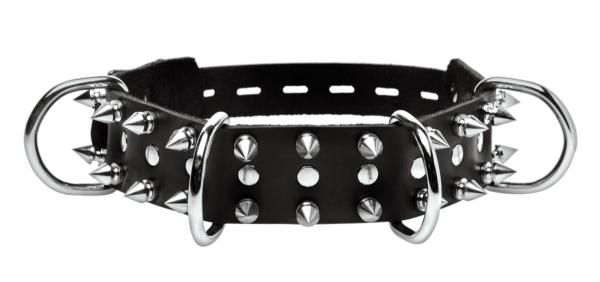 This intense piece is not just for show. The sharp spikes lining the front are accented by 4 metal D-rings, to which a variety of accessories may be attached. The collar has a rolling locking buckle so you can keep your pet on a tight leash. Measurements: 24 inches in total length, adjusts from 15 to 21 inches in circumference, 2 inches in width. Material: Leather, metal. Color: Black. Note: Locks sold separately Warning: This is a NEW item that is not in retail packaging, usually a plain box, wrapped in plastic or a poly bag.