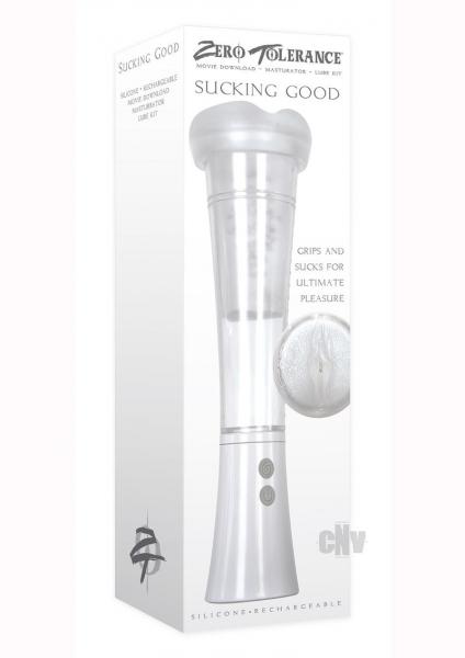That`s one good sucking vibrating masturbator! Experience the unique sensation of a stretchy sleeve inside a vacuum pump that squeezes and pulls like the real thing, with a tight TPE chamber textured for extra pleasure. Choose from three speeds of vacuum suction, or opt for the special feature that sucks and releases alternately for an incredible fantasy-fulfilling sequence, all the while humming along with a 9-speed vibrating base. Use the silicone sleeve to turn your vacuum toy into a penis pump to build length and girth - and even keep track with measurements along the side. All parts of this toy fully dissemble for cleaning with Zero Tolerance Masturbator Cleaner and a warm water rinse, and get a head start on your fun with a adult movie DVD download and free foil pack of lube!